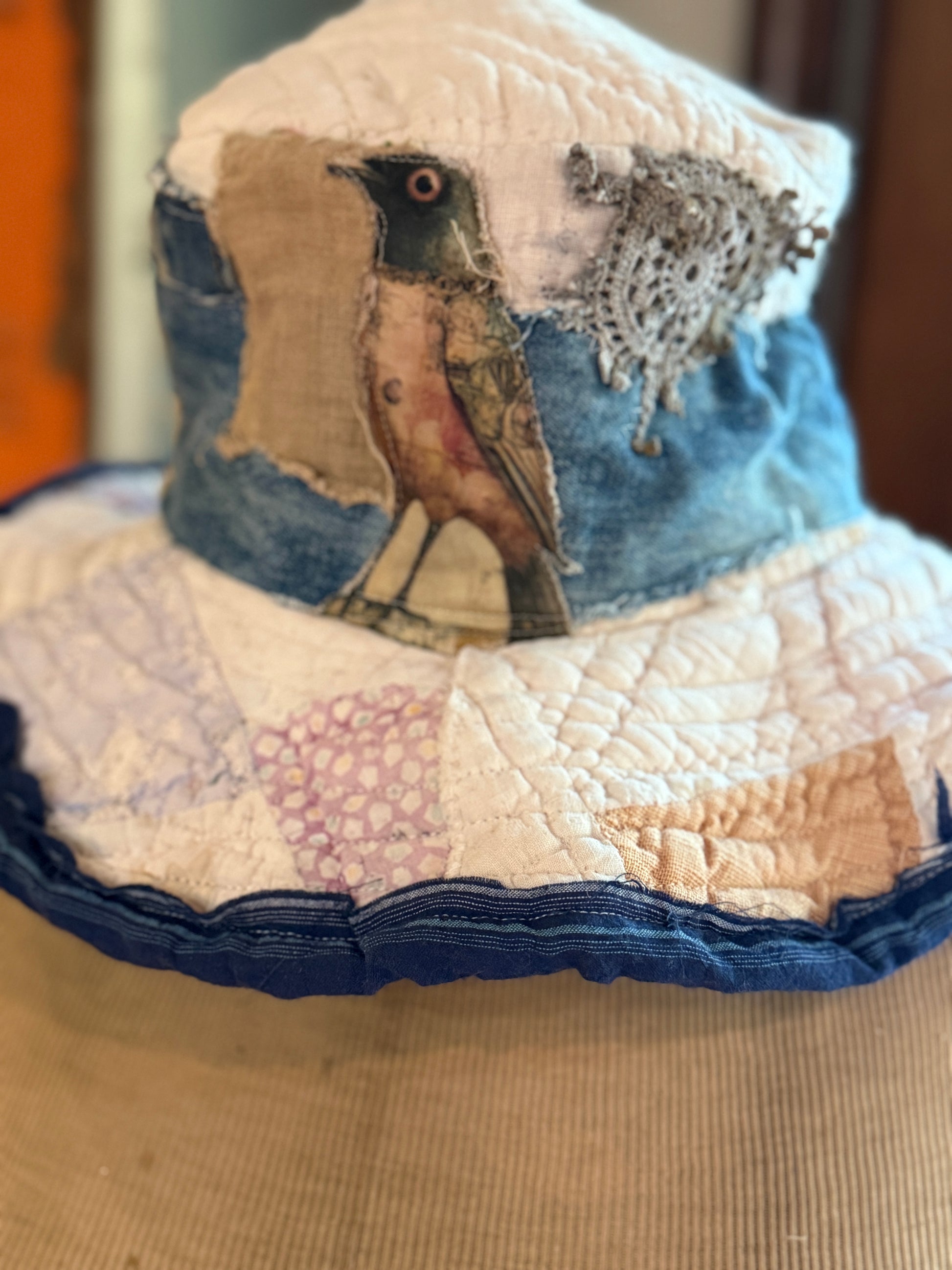The brim and crown are made from a quilted material with a charming, patchwork design featuring soft pastels and floral prints. The side of the hat is made of a weathered denim, providing a rustic contrast. The centerpiece is a vintage fabric scrap featuring a detailed depiction of a bird with a reddish breast and a black eye, giving the hat a whimsical, vintage feel. Delicate lace and other small embellishments are sewn into the design, highlighting the handmade nature of this special piece.